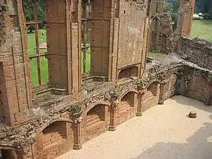 The most significant of Gaunt's buildings is his great hall. The great hall replaced an earlier sequence of great halls on the same site, and was strongly influenced by Edward III's design at Windsor Castle.[16] The hall consists of a "ceremonial sequence of rooms", approached by a particularly grand staircase, now lost.[17] From the great hall, visitors could look out through huge windows to admire the Great Mere or the inner court.[18] The undercroft to the hall, used by the service staff, was lit with slits, similar to design at the contemporary Wingfield Manor.[1] The roof was built in 1376 by William Wintringham, producing the widest hall, unsupported by pillars, existing in England at the time.[19] There is some debate amongst historians as to whether this roof was a hammerbeam design, a collar and truss-brace design, or a combination of the two.[19][lower-alpha 2]