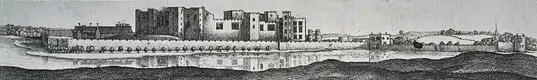 To the north-west of the castle are earthworks marking the spot of the "Pleasance", created in 1414 by Henry V.[49] The Pleasance was a banqueting house built in the style of a miniature castle.[49] Surrounded by two diamond-shaped moats with its own dock, the Pleasance was positioned on the far side of the Great Mere and had to be reached by boat.[49] It resembled Richard II's retreat at Sheen from the 1380s, and was later copied by his younger brother, Duke Humphrey of Gloucester, at Greenwich in the 1430s, as well by his son, John of Lancaster at Fulbrook.[50] The Pleasance was eventually dismantled by Henry VIII and partially moved into the left-hand court inside the castle itself, possibly to add to the anachronistic appearance.[39] These elements were finally destroyed in the 1650s.[51]