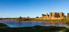 Beyond the Brays are the ruins of the Gallery Tower, a second gatehouse remodelled in the 15th century. The Gallery Tower originally guarded the 152-metre (499-foot) long, narrow walled-causeway that still runs from the Brays to the main castle.[6] This causeway was called the Tiltyard, as it was used for tilting, or jousting, in medieval times. The Tiltyard causeway acted both as a dam and as part of the barbican defences.[5] To the east of the Tiltyard is a lower area of marshy ground, originally flooded and called the Lower Pool, and to the west an area once called the Great Mere. The Great Mere has been drained and cultivated as a meadow, but it was originally a large lake covering around 100 acres (40 ha), dammed by the Tiltyard causeway.[7]