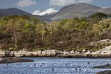 Kenmare River and the surrounding areas are a sanctuary to wild salmon[6] and a home to many other species, including narrow-mouthed whorl snail, lesser horseshoe bat, otter, and common seal, arctic tern, burrowing anemone, and many more.[2] It is also the only known body of water in Ireland where northern sea fan occurs.[2] Rivers flowing into it, including Roughty, Sheen, Slaheny, and Blackwater, have been known to be abundant in fish, in particular sea trout. A decline in fish numbers was observed in the mid 1990s,[7] and local fishermen communities put the blame on sea lice infestations caused by the operation of salmon farms.[7] Further objections against the establishment of new farms were raised in the early 2000s.[8] Local residents have also been protesting against seaweed harvesting in the bay.[9]