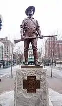 Kennedy Plaza is home to three public art works. The most prominent is the 1871 Soldiers’ and Sailors’ Monument[31] which occupies space directly in front of Providence City Hall. Dedicated originally in 1871, it was sculpted by Randolph Rogers with the pedestal designed by architect Alfred Stone. The monument was moved during the City Hall Park/ Exchange Place transformation in 1913 to the center of the plaza, and returned to its present location in 1997. Large bronze plaques on the monument’s base list residents killed in the war.[31] Another plaque honors Rhode Island's African-American veterans.[31] A dedication on a northeastern plaque reads ”Rhode Island pays tribute to the memory of the brave men who died that their country might live.”[31] In late 2016, the Downtown Parks Conservancy of Providence started a fundraising effort to restore the monument and the infrastructure immediately around it.[32]