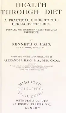 Similar to his father, Haig was a proponent of the uric-acid free diet.[2] He wrote about the subject in his book Health Through Diet, which received advice and assistance from his father. Haig argued that excess uric acid was a major cause of disease. For example, he attributed anemia, Bright's disease, cancer, diabetes, heart disease, pneumonia and rheumatism to excess uric acid.[3] Haig stated that the uric-acid free diet greatly improved his health and he had eighteen years of experience on the diet.[3]