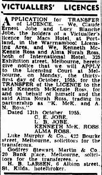 - ↑ They had held the License for the hotel since October 1955 Victuallers' Licenses, The Argus, (Tuesday, 18 October 1955), p.14.