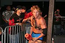 On November 1, 2008, Omega appeared for Pro Wrestling Guerrilla (PWG) during the 2008 Battle of Los Angeles, where he was defeated in the first round of the tournament by local talent Brandon Bonham.[56] The next night, during a three-way tag team match in which Omega competed, he was Irish whipped into the ropes by Davey Richards, only for the force to snap the middle and bottom ropes, throwing Omega out of the ring.[57] Three months later, Omega returned to the promotion at Express Written Consent, where he was defeated by El Generico after referee Rick Knox hit him with a leaping clothesline after Knox grew tired of Omega abusing him.[58][59] At PWG's hundredth show on April 12, 2009, he lost to Bryan Danielson.[60]