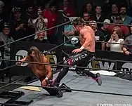 Omega signed a four-year contract with All Elite Wrestling (AEW) on February 7, 2019.[150] He serves as an executive vice president of the promotion as well as one of its in-ring talents.[151] He competed at the promotion's inaugural event, Double or Nothing, where he lost to Chris Jericho in the main event, after which both men were attacked by Jon Moxley.[152] A scheduled match between Omega and Moxley for the All Out pay-per-view did not take place due to Moxley suffering an MRSA infection.[153] Omega instead competed against Pac at All Out, where he was defeated.[154][155] On the premiere episode of Dynamite on October 2, Omega was taken out by a returning Moxley during a six-man tag team match, with Omega's team later losing the contest.[156] In the main event of Full Gear on November 9, Omega lost to Moxley in an unsanctioned Lights Out match.[157][158]