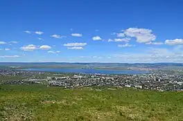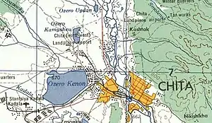 Kenon lake is part of the Ingoda river basin, It is located in the Chita-Ingoda Depression (Читино-Ингодинская впадина), in the western outskirts of Chita, Zabaykalsky Krai. A few small streams flow into the lake. The main ones are the Ivanovka and Kadala rivers,[4] which have their sources in the neighboring Yablonovy Range. The outflow is through a 2 km (1.2 mi) long channel leading to the Ingoda that fills with water only in the wettest years.[3][5]