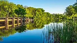 The Grand River runs through the county. On its west bank are burial mounds, remnants of the Hopewell Indians who lived there.[5] In the 18th century the Odawa migrated to this area and established multiple villages along the Grand River valley.[6] By the 19th century there were estimated to be over 1000 Odawa.[6][7] The fur trade became an important industry in the valley during the early 19th century. After the War of 1812, Rix Robinson and Louis Campau were the earliest traders in the area.[8] In 1826, Campau established a trading post in Grand Rapids. In 1831, he bought land and platted the town. Campau is considered the town's "father".[9][10][11] One year later, government surveyor Lucius Lyon purchased land north of Campau's property. Campau surveyed and platted the village following Native American trails[10] and Lyon had platted his property in an English grid format, which meant there were two adjoining villages, with different platting formats.[10] Campau later merged the villages under the name of Grand Rapids.[10]