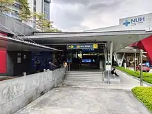 The station is located underneath the National University Hospital (NUH) Medical Centre near the junction of South Buona Vista Road and Kent Ridge Road.[14] The station is at the east of National University of Singapore (NUS) campus.[15] Other landmarks include Singapore Science Park I and Kent Ridge Park.[16] The station serves NUS internal bus shuttle services that connects the station to other areas of the NUS campus.[17]