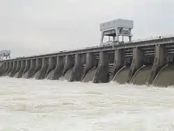 Kentucky Dam is a hydroelectric dam on the Tennessee River on the county line between Livingston and Marshall counties in the U.S. state of Kentucky. The dam is the lowermost of nine dams on the river owned and operated by the Tennessee Valley Authority, which built the dam in the late 1930s and early 1940s to improve navigation on the lower part of the river and reduce flooding on the lower Ohio and Mississippi rivers. It was a major project initiated during the New Deal of President Franklin D. Roosevelt's administration, to invest in infrastructure to benefit the country. The dam impounds the Kentucky Lake of 160,000 acres (65,000 ha), which is the largest of TVA's reservoirs and the largest artificial lake by area in the Eastern United States.[1] It was designated as an National Historic Civil Engineering Landmark by the American Society of Civil Engineers in 1996 and listed on the National Register of Historic Places in 2017.[2]