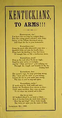 On April 15, 1861, President Lincoln sent a telegram to Kentucky governor Beriah Magoffin requesting that the Commonwealth supply part of the initial 75,000 troops to put down the rebellion.[15] Magoffin, a Southern sympathizer, replied "President Lincoln, Washington, D.C. I will send not a man nor a dollar for the wicked purpose of subduing my sister Southern states. B. Magoffin"[19] Instead, most Kentuckians favored John J. Crittenden's position that the Commonwealth should act as a mediator between the two sides.[15] To that end, both houses of the General Assembly passed declarations of neutrality, a position officially declared by Governor Magoffin on May 20, 1861.[15]