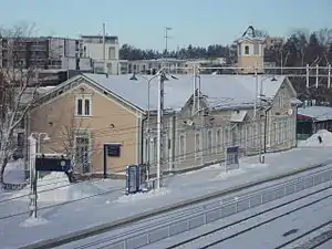 Kerava railway station (Finnish: Keravan rautatieasema, Swedish: Kervo järnvägsstation) is located in the town of Kerava, Finland. It is located approximately 29 kilometres (18 mi) from Helsinki Central railway station. Six tracks run through the station, three of which have platforms for passenger traffic. Kerava is a significant junction station, with connections from the main track from Helsinki to Riihimäki to the tracks to Lahti, Sköldvik, Porvoo, and to the Vuosaari Harbour.