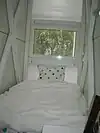 The iron structure contains two floors, and has one bedroom, a kitchen, a bathroom and a living area. It has two non-opening windows, with sunlight also entering through translucent glass panels that make up the walls. The entire interior is painted white and the building's electricity is obtained from a neighboring building. The house has custom water and sewage technology and is not connected to the city-provided water systems.[3] Because of its small size, the building only accommodates a small 2-beverage refrigerator, and occupants use a ladder to travel from level to level. Entry is via retractable stairs that, when closed, become the living area.[4]