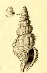 The small delicate, white shell has an ovate-fusiform shape. It contains 8 whorls of which 2½ in the protoconch, with a pale straw color, globose and microscopically cancellate ribs. The subsequent whorls contains thick, rounded ribs, crossed everywhere by rough, spiral lirae; nine ribs and nine lirae in the body whorl. The aperture is narrow. The outer lip is slightly incrassate. The columella is oblique. The siphonal canal is recurved.[2]