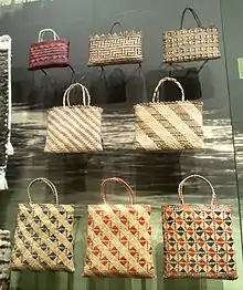 Kete are traditional baskets made and used by New Zealand's Māori people.[1] They are traditionally woven from the leaves of New Zealand flax called harakeke and have two handles at the top.[2] Other materials are sometimes used, including sedge grass or the leaves of the nikau palm and cabbage tree.[1][3] Modern designs may also use dyed materials.[4][5] Some kete, known as kete whakairo, or "patterned bag", feature intricate geometric patterns, while more everyday baskets are known as kete mahi or simply kete.[6][7]