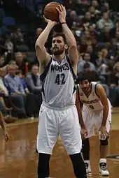 Love led the NBA in rebounding, averaging 15.2 per game.[61] He won the NBA Most Improved Player Award after increasing his points per game by 44 percent and his rebounds per game by 38 percent over his previous season. Love established career highs in rebounding, scoring (20.2), assists (2.5), double-doubles (64), field goal percentage (.470), free throw shooting (.850), and minutes played (35.8). He became the first player to average at least 20 points and 15 rebounds in a season since Malone in the 1982–83 season.[63] While amassing double-doubles, a statistical hallmark of traditional power forwards, Love was also evolving into a stretch four, making a career-high 41.7 percent of his 3's, while upping his three-point attempts to almost three per game.[63][64] He emerged as the new face of the franchise since Garnett was traded from the Timberwolves to the Boston Celtics in 2007.[65] In 2010–11, Love's No. 42 was the Wolves' top-selling jersey; sales were comparable to Kevin Garnett's when he was in his prime.[66]