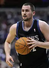 On February 6, Love was given a two-game suspension for stepping on the face of Houston's Luis Scola.[73] After the February 4 game, Love had said, "I mean, he fell down after the play. He just kind of laid there and... I just happened to be there. I had nowhere to go. I got kind of tripped up and I just had nowhere to step. He was right there... and it happened to be his face."[71] On February 25, Love participated in the Three-Point Contest and defeated Kevin Durant in the final tie-breaking round to win the contest. Love scored a season high 42 points in a win over the Portland Trail Blazers on March 3.[74] Love set a franchise record for most games scoring over 30 points in a season on March 12 in a victory over the Phoenix Suns.[75][76] He also had a career-high 51 points in a 149–140 double overtime loss to the Oklahoma City Thunder. The following game, Love erupted for 30 points and grabbed 21 rebounds in a win over the Denver Nuggets.[77] For the season, Love was named to the All-NBA second team and finished sixth in MVP voting.[78] In the offseason, Love voiced frustration with Minnesota for not being a playoff team. The Timberwolves finished with the Western Conference's fourth-worst record at 26–40, which was still the franchise's most wins since the 2006–07 season.[67][79]