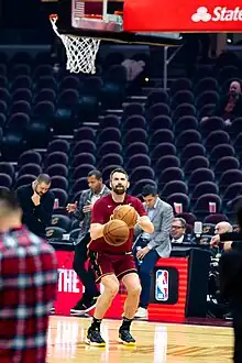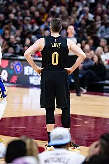In the Cavaliers' season opener on October 17, 2017, Love scored 15 points in a 102–99 win over the Boston Celtics. He hit a critical 3-pointer with 46.3 seconds left to put Cleveland up 102–98.[124] On November 7, 2017, he had a then season-best game with 32 points and 16 rebounds in a 124–119 win over the Milwaukee Bucks.[125] On November 28, 2017, he scored 32 of his 38 points in the first half of the Cavaliers' 108–97 win over the Miami Heat. He scored 22 points in the first quarter and finished 10 of 16 from the field and 14 of 17 on free throws.[126] On December 25, 2017, he had a game-high 31 points and a season-best 18 rebounds in a 99–92 loss to the Golden State Warriors.[127] On January 30, 2018, Love left the Cavaliers' game against the Detroit Pistons with a fracture in his left hand.[128] He missed six weeks and 21 games with the injury, returning to action on March 19 against the Bucks. He scored 18 points in 25 minutes in a 124–117 win.[129] Two days later, he recorded 23 points and 12 rebounds in a 132–129 win over the Toronto Raptors. He knocked down his 1,000th career 3-pointer during the game.[130] On April 1, 2018, he recorded his 400th career double-double with 13 points and 13 rebounds in a 98–87 win over the Dallas Mavericks.[131] In Game 2 of the Cavaliers' second-round playoff series against the Raptors, Love had his best game of the postseason with 31 points and 11 rebounds in a 128–110 win, helping Cleveland take a 2–0 lead in the series. Love missed matching his career playoff high by one point.[132] In Game 4 against Toronto, Love scored 23 points in a 128–93 series-clinching win. During the game, Love became the fourth player in Cleveland history with 500 career playoff rebounds, joining LeBron James, Tristan Thompson and Zydrunas Ilgauskas.[133] In Game 1 of the NBA Finals, Love recorded 21 points and 13 rebounds in a 124–114 overtime loss to the Warriors.[134] The Cavaliers went on to lose the series in four games.