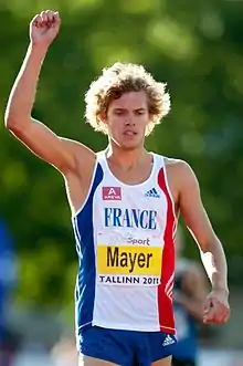 At the 2017 World Championships in Athletics in London, Mayer completed his first decathlon of the year and won his first World Championships gold medal with a world-leading score of 8768 points, ahead of Germans Rico Freimuth (silver, 8564 points) and Kai Kazmirek (bronze, 8488 points).[32] This was also France's first international gold medal in the decathlon.[33] Despite not coming first in any specific discipline, Mayer achieved new personal bests in the 100 metres (10.70s, 929 points), 400 metres (48.28s, 897 points), and the 110 metres hurdles (13.75, 1007 points).[34][35][36] A setback in the pole vault – where he cleared his only mark at 5.10m only at the third and last try – 30 cm below his personal record – prevented him from breaking his personal record.[37]