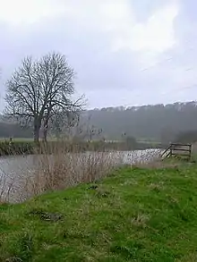 The remains of the villas are located in what is now known as the Keynsham Hams, an alluvial flood plain located in the River Avon Valley just south of the River Avon near the town of Keynsham in Somerset. The Hams are an open area consisting of fields, pastures, and meadows, divided by hedgerows and drainage ditches.[1] To the north of the Hams lies the Avon River and Cleeve Wood. To the south the Hams is bordered by a railroad line and the town of Keynsham. This landscape has recently been classified as a "Floodplain Grazing Marsh," and a UK BAP priority habitat, or a natural area that provides a unique range of habitats for flora and fauna.[1] The landscape is dominated by the now shuttered Somerdale Chocolate Factory at the far east of the Hams, which was built between 1923 and 1935. The factory site was closed in 2011 and sold in 2012, and is currently being redeveloped into a housing community.