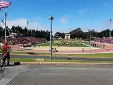 With pending demolition, the bleacher planks of Kezar Stadium were sold off to fans at a party in April 1989.[10][11] In June, the stadium was demolished and rebuilt with a much smaller seating capacity of 10,000. The upgrades included an eight-lane, all-weather track and a grass athletic infield suitable for soccer, football, and lacrosse.[12]