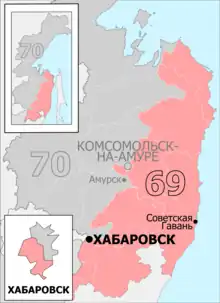 The Khabarovsk Constituency (No.69[lower-alpha 1]) is a Russian legislative constituency in the Khabarovsk Krai. In its previous configuration (1993-2007) the district was centred in the city of Khabarovsk (60% of district's population), its suburbs and exurbs down to Bikin. However, the Khabarovsk constituency was gerrymandered in 2016 and now includes just southern parts of Khabarovsk and large mostly rural southern and eastern Khabarovsk Krai up to Komsomolsk-on-Amur suburbs.