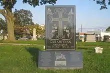 The gravestone was designed by Leo Hanian, an ethnic Armenian who fled persecution from Azerbaijan.[1] The gravestone is designed in an Armenian khachkar style and is made out of Indian black granite with a depiction of an ornate Cross. The gravestone carries Garabedian's name and dates of birth and death along with two images of the Independence Hall of Philadelphia and the Cathedral of Holy Etchmiadzin in Armenia.[1] The lower part of the tombstone describes his life in detail with an image of the USS Grand Gulf and a 35-star U.S. flag.[1]