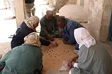 Kharbaga is a two-player abstract strategy game from North Africa. In a way, it is a miniature version of Zamma; however, there are more diagonal lines per square on the board as compared to Zamma. The game is considered part of the Zamma family. The game is also similar to Alquerque and draughts. The board is essentially an Alquerque board with twice the number of diagonal lines or segments allowing for greater freedom of movement. The initial setup is also similar to Alquerque, where every space on the board is filled with each player's pieces except for the middle point of the board. Moreover, each player's pieces are also set up on each player's half of the board. The game specifically resembles draughts in that pieces must move in the forward directions until they are crowned "Mullah" (or "Sultan") which is the equivalent of the King in draughts. The Mullah can move in any direction.
