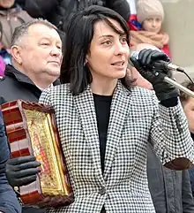 Following the Euromaidan protests in Ukraine and Petro Poroshenko's election as President of Ukraine, she became one of Saakashvili's close protégées to join him as he took a leadership role in the new pro-Western government of Kyiv.[8] In 2015, she was granted the Ukrainian citizenship just as Saakashvili was appointed Governor of the Odesa Oblast, formally at the request of Internal Affairs Minister Arsen Avakov, in whose cabinet she first served as an adviser.[9] On November 4, 2015, she was appointed by President Poroshenko as the first Chief of the National Police of Ukraine, a position newly created as part of MIA reforms. She took over Ukrainian law enforcement at a time when it had small public approval, crime was sharply rising,[10] most police officers were without full equipment,[11] and corruption remained strongly entrenched. In March 2016, she dismissed the head of the local police division of Vinnytsia after it was discovered he had been backing separatism in Eastern Ukraine.[12] According to later reports by some Ukrainian media outlets, Oleksandr Tereschuk, the dismissed head of the police division of Kyiv, planned large-scale protests by police officers against her.[13]