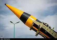 The Kheibar (Persian: خیبر), also known as Khorramshahr-4,[1] is an Iranian medium-range ballistic missile from the fourth generation of the Khorramshahr missile family manufactured by the Ministry of Defense of the Islamic Republic of Iran. This missile was unveiled on Thursday, June 4, 1402 in the presence of Mohammad Reza Ashtiani, Minister of Defense of the Islamic Republic. The Khoramshahr ballistic missile[2] offers a range of 2,000 km and can carry 1,500-kilogram warhead.[3][4]