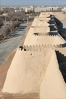 Khiva is split into two parts. The outer town, called Dichan Kala, was formerly protected by a wall with 11 gates. The inner town, or Itchan Kala, is encircled by brick walls, whose foundations are believed to have been laid in the 10th century. Present-day crenellated walls date back to the late 17th century and attain the height of 10 meters.