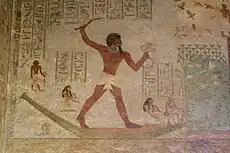 The east wall houses the entrance to the shrine, as well as two large depictions of Khnumhotep II hunting in the marshes, one on the north side and the other on the south side. To the south he is harpooning two fishes and to the north he is fowling with a throwing stick.[2]: 105 These hunting in the marshes scenes help protect the deceased in the afterlife as well as guarantee his rebirth through connotations of sexuality.[2]: 115 Beneath him, north of the door, there are pictures of several people fishing and beneath him on the south side are representations of fighting boatmen. Collectively this wall represents the perpetual renewal of Khnumhotep II.