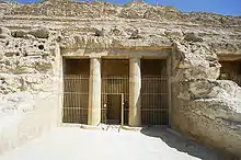 The tomb is fronted by a columned portico and a small courtyard; the courtyard would have been surrounded by mud-brick walls. The small columned portico is on the west side of the courtyard, directly in front of the tomb entrance.[2]: 30 The ceiling of the portico is curved similar to the shape of a segmented barrel. The rock around the doorway leading inside the tomb to the chapel was smoothed and flattened, on which a fourteen line inscription is giving the list of the festal days for the services of funeral offerings, called percheru, along with the name and titles of Khnumhotep II.[4]: 53 The floor of the main chamber (also referred to as the chapel) is sunk into the ground below the level of the open outer court and is descended into by three steps.[4]: 53 The chapel is the main chamber cut straight back into the cliff almost symmetrical with 4 columns and two large shafts (that lead to burial chambers) are cut into the floor. These four main columns support a ceiling that is divided by three segmented barrel shapes.[5] These vaults are painted in a pattern that may be referencing a tent.[2]: 33 The only light for this chamber would have come from the doorway to the portico and originally a door, between the portico and the chamber, could have been used to close the tomb to the outdoor elements.[4]: 52 Percy Newberry notes that the only remain from the inward swinging door is the pivot-hole. On the doorjambs are prayers to Osiris and Anubis above a seated Khnumhotep II who is facing inward.[2]: 32 At the back of this main room (east wall) is a small rectangular shrine approached by a step about 13 centimetres (5.1 in) high. Newberry mentions that from his survey of the tomb there was a statue here of a seated Khnumhotep II, but the entire statue had been cut away and only a portion of the seat remains.[4]: 53