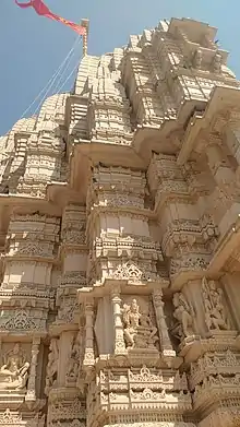 The temple is built in Mahameru Prasad design of Maru-Gurjara architecture. It is 289 ft 7 inch long, 253 ft wide and 159 ft 1 inch high.[4] The height of the temple is kept 10 feet lower than the Somnath temple to respect its supremacy.[1] The primary plinth (jagati) of the temple is 18 feet high and the secondary plinth is 6 feet 5 inch high. The kalasha on the top of the temple is gold plated and 14 feet tall and weigh 6 ton. The flag mast is 40 feet high. About 650 statues adorning the exterior of the temple are chiseled by artisans from Odisha. The pillars, beams, toranas and roofs are carved by artisans from Rajasthan. The carvings include the 72 scenes from epics Mahabharata and Ramayana. About 230000 cubic feet of Bansi Paharpur pink stone is used for the construction.[4]