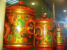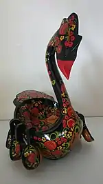 Khokhloma (also Hohloma, Russian: хохлома; Russian pronunciation: [xəxɫɐˈma]) or Khokhloma painting (хохломская роспись, Khokhlomskaya rospis) is a style of Russian art traditionally painted on wooden household items. It is known for its curved linear features depicting vivid small flowers, berries, grasses, and leaf motifs. The Firebird, a common and popular figure from the Russian fairytales is often featured as the main subject matter.