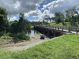 On Friday 23 June 1876, the Kholo Bridge across the Brisbane River to Chuwar (27°33′54″S 152°44′51″E / 27.5650°S 152.7476°E) was officially opened. Due to a period of heavy rain, the river was swollen and the deck of the new bridge was 3 feet (0.91 m) below the surface of the river. Determined to have a first official crossing of the bridge, a group of men pulled a buggy containing a "courageous lady" across the submerged bridge and Mrs Foote smashed a bottle against a bridge post and named the bridge. A banquet followed the ceremony.[4]
