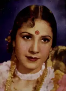 Her peak period came when she moved to Bombay to act in Ranjit Movietone films with actors like K. L. Saigal and Motilal.[2] She achieved immense popularity when she acted opposite the famous singer-actor K. L. Saigal in the Chaturbhuj Doshi directed, Bhukt Surdas (1942), followed by Tansen (1943) and was referred to as the "first of the singing stars".[7] Her other two main lead stars were Jairaj, and Ishwarlal.[1]