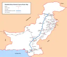Khushhal Khan Khattak Express (Urdu: خوشحال خان خٹک ایکسپریس) is a passenger train operated daily by Pakistan Railways between Karachi and Peshawar.[1] The trip takes approximately 34 hours and 15 minutes to cover a published distance of 1,512 kilometres (940 mi), traveling along a stretch of the Karachi–Peshawar Railway Line and Kotri–Attock Railway Line.[2][3] The train named after Khushhal Khan Khattak, a Pashtun nationalist and poet, warrior, scholar, and chief of the Khattak tribe.[4].Train is suspended after covid 19, but efforts are being made to run this train.