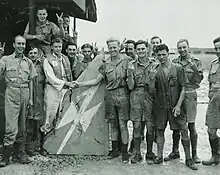 Buffalo pilots of No. 488 (New Zealand) Squadron based at Kallang display the tail fin of a Mitsubishi Ki-46 which they shot down over Johore, Malaya, January 1942