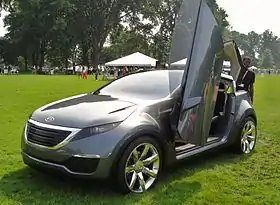 The Kue was designed, in part, was to distinguish itself from Hyundai's cars, according to then-US president of Kia Motors, Len Hunt.[2] It only had only two doors, which open scissor style to allow access to all 4 seats.[3] The concept car also boasted a 400-hp, 4.6-liter V8 engine.[2]