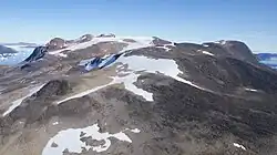 There is a number of smaller mountain lakes on the island, and one larger Tasersuaq Lake at the lower, eastern end of the island.[3] The island is very mountainous, with a glaciated ridge spanning its entire length. The highest point on the island is an unnamed peak of 940 m (3,080 ft) in the center of the island. Several other summits of the island ridge exceed 700 m (2,300 ft), from the massif overlooking Tasersuaq Lake in the east to the bastion over the Wilcox Head promontory in the west.[3]