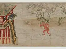 The Kibi Daijin Nittō Emaki originally consisted of a single scroll 32 cm (13 in) high by 2,440.8 cm (960.9 in) long, the longest single scroll ever known, before being separated into four parts.[2][3] It dates from the second half of the 12th century (end of the Heian period (794–1185) or early Kamakura period (1185–1333)), when a renewed interest in the narrative subjects and life of the people was reflected in the topics of contemporary emakimono.[4][5]