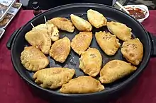 Kibinai, kybyn, or kibin (plural in Karaim language: kybynlar / Qıbınlar (Common Turkic Latin); singular in Lithuanian: kibinas) are traditional pastries filled with mutton and onion, popular with the Karaite ethnic minority in Lithuania.[1] As everything Karaite in Lithuania, they are mostly associated with the city of Trakai.[2] English-language travel guides compare them to Cornish pasties.[3] Initially, they come from Crimea from where the Grand Duke of Lithuania Vytautas the Great took Tatar and Karaite families to become their guards in order to thank them for their help during his fight against the Golden Horde.