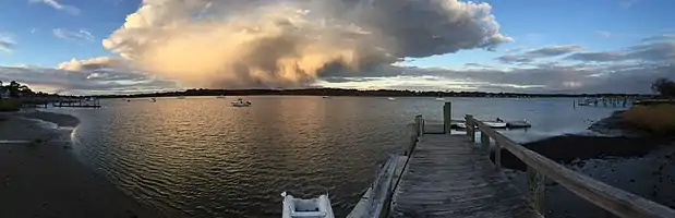 The name Kickamuit is a Narragansett word that has numerous spellings. The river was a major traffic artery during the American Revolutionary War, and supplies traveled upriver daily.[2] By the 1800s, oyster beds were a major revenue source, but effluent from the nearby Parker Mills and general sewage pollution killed most of the oysters by 1910.[2] The Kickamuit River oyster industry was ended with the 1938 New England hurricane.[2]