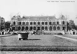 In 1921, Emperor Khải Định (1885-1925) started to build a new palace in European style within the Forbidden Purple City of Huế.[1] When completed in 1923, the Kien Trung palace became his own residence with the Imperial City.[1][2] Khải Định passed away at the palace in 1925. A model of palace in papier-mache was burned during the funeral ceremony, in the hope that his afterlife residence would be similar to the Kien Trung palace.[3]