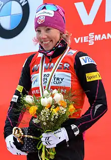 ![]() Kikkan Randall after winning the Stockholm Royal Palace Sprint in March 2013 | |