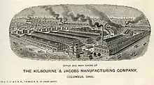 Kilbourne and Jacobs Manufacturing Company was founded in 1881 by James Kilbourne and HL Jacobs in Columbus, Ohio with an initial investment of $100,000.[1] Built in close proximity to Union Station,[2] the company produced wheelbarrows, horse-drawn railroad scrapers and other earth-moving equipment during the turn of the century.[3] Several years after opening, the company developed a line of hand trucks, forty percent of which were sold to the New York Central Railroad.[2] By the end of the 19th century, Kilbourne and Jacobs was the largest manufacturer of earth-moving equipment in the United States.[4] The Ohio State Journal reported in 1890 that the company produced approximately 150,000 hand trucks per year with between 400-600 workers, pushing annual sales to nearly $1 million.[2][1]