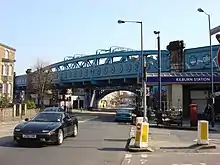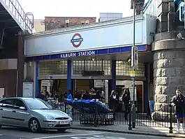 Kilburn serves the area of the name itself, which is a moderate commercial district and dense residential suburb. The place was said to be named after Cylla, then a Saxon, or from the 1121 Saxon term "Cuneburna" for "the cattle stream".[8] The earliest settlements near the station date back to 1847.[9] The station is on the A5 Kilburn High Road or Shoot-up Hill. The road connects several stations including Brondesbury and Kilburn High Road. Nearby landmarks include the Red Lion, Kiln Theatre, Kilburn Grange Park, ICMP London and Kingsgate Primary School.[10]