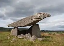 East of the R261 on rough moorland is the larger portal tomb Dg. 70 with two chambers, 9 m apart, and a modern field wall in-between. The north-eastern chamber has a roof stone with a length of 4.2 m which rests on two portal stones, both of 1.8 m height, and a very small pad-stone which in turn rests on the backstone of 1.3 m height. The smaller, south-western chamber has portal stones of 1 m height. The roof stone with a length of 1.9 m is partly dislodged.[5][10] The sill stone between the portal stones has a rectangular piece missing, a feature that is shared with the portal tombs of Poulnabrone, Ballybrittas, and Tawnatruffaun. Most of the stones are from grey granite outcrops in close vicinity to the tomb. The backstone in red Ardara granite stands in a stark contrast to the overall grey, it originates possibly from a cliffy extrusion 200 m south of the tomb.[11]