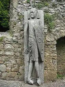 The main feature is the Cantwell Fada, an effigy of a knight from the 1320s/30s;[8] this would have been intended to lie horizontally as a cover to his tomb, but is now set vertically [9][10] and protected by a transparent cover. When the church was used as a school, misbehaving children were made to kiss the effigy. Later, it had been covered by soil to protect it until 1840, when James Graves uncovered and cleaned it.[7]