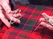 Two styles of kilt pins can be seen in the accompanying photo. (Note the kilt damage resulting from using the thick-shanked version, however.) This is a decorative item meant to be pinned through the outer apron only. It is not heavy enough to prevent the kilt apron from blowing open in a breeze. It should never be pinned through both aprons, since this would result in distorting the proper hang and action of the kilt and at worst could result in tearing the kilt. Of course, Highland dancers do not wear the pin through both aprons (when they wear one at all) since the action of the kilt is an essential part of the dance.